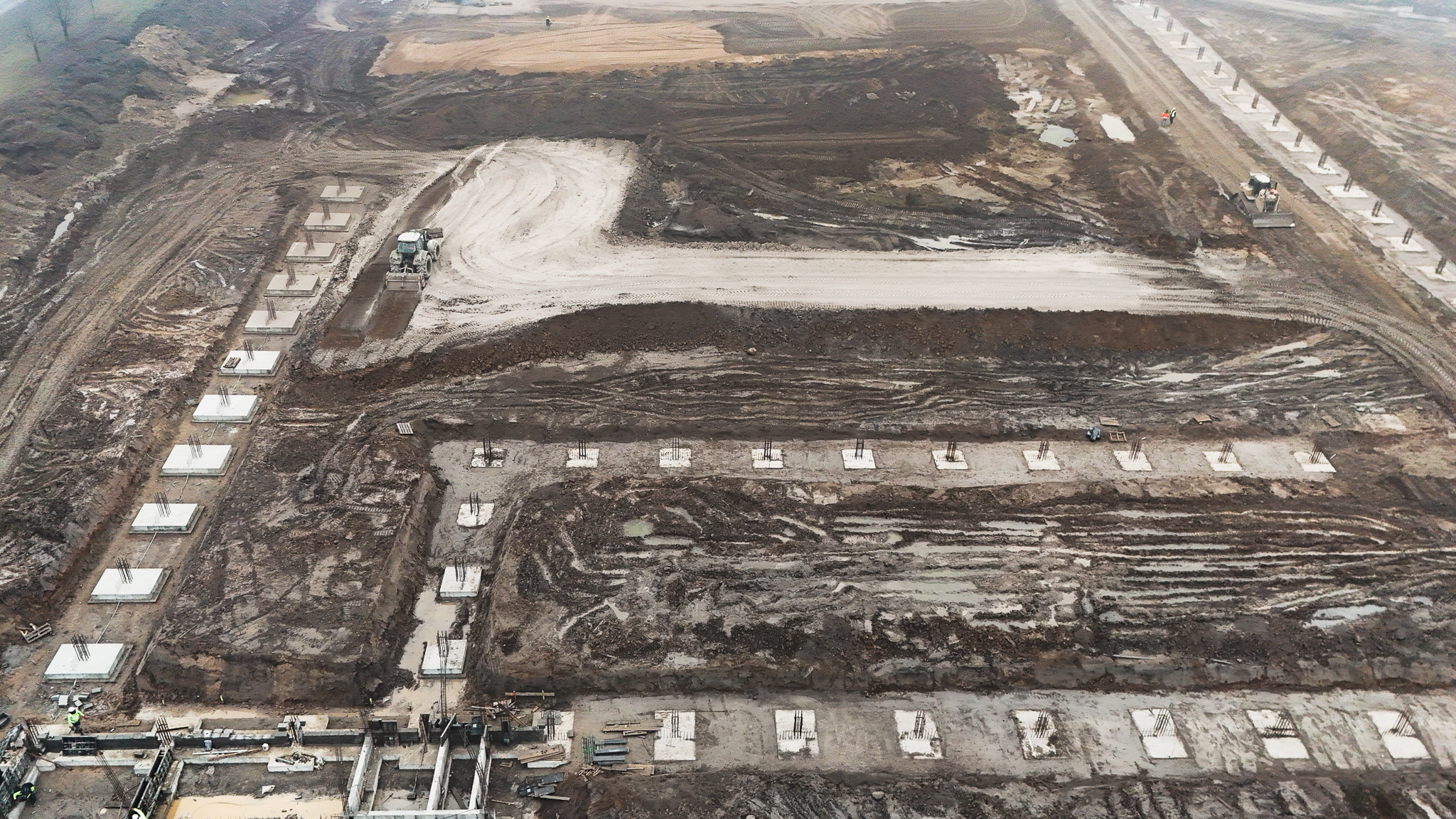 Zakres prowadzonych prac obejmuje roboty ziemne i przygotowanie terenu, wykonanie kompletnych fundamentów oraz izolacji przeciwwilgociowych i termicznych. W ramach realizacji powstaje konstrukcja żelbetowa obiektów, w tym ściany, rdzenie, słupy, belki, stropy prefabrykowane typu filigran oraz schody żelbetowe. Równolegle wykonywane są konstrukcje murowe ścian zewnętrznych i wewnętrznych części biurowej.