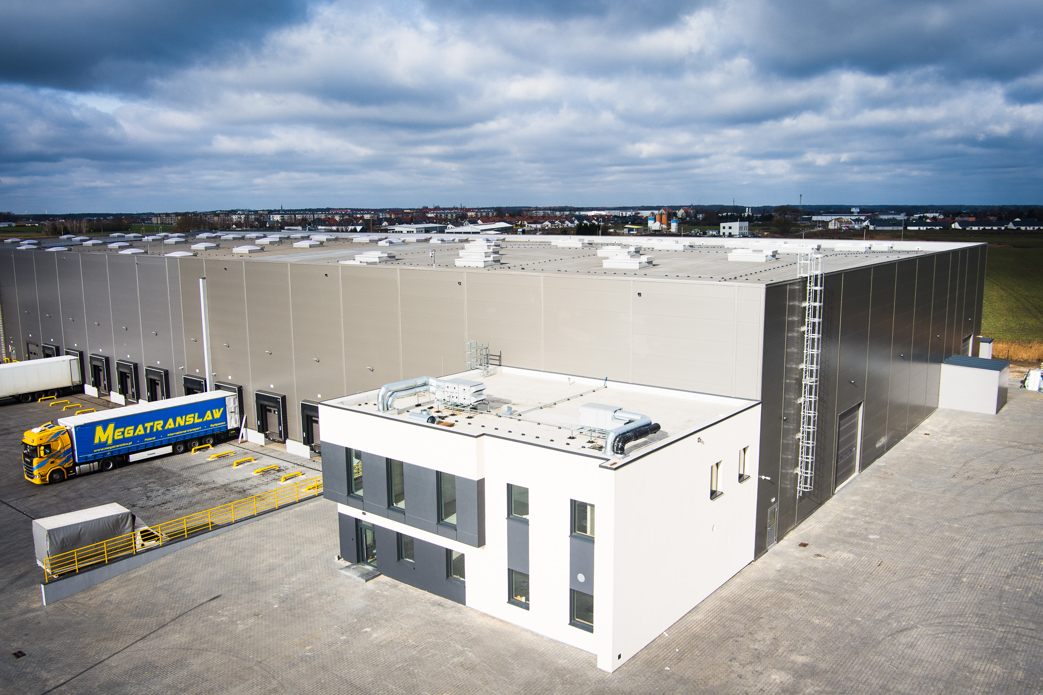 Wzniesiono dwukondygnacyjny budynek socjalny, składający się z części biurowych, szatni, jadalni, pomieszczenia ładowania wózków elektrycznych oraz sanitariatów.